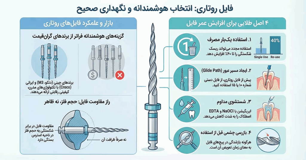 واقعیت این است که همهی درمانها نیاز به گرانترین فایل بازار ندارند. خوشبختانه در بازار ایران، انتخابها متنوعتر از همیشه است. برندهای چینی مثل فایل روتاری دنکو و M3 با استفاده از تکنولوژیهای CM-Wire و Blue Wire، کیفیت قابل قبولی را با قیمت منطقی ارائه میدهند. در کنار آنها، برند ایرانی Croco با تکنولوژی Heat Activation توانسته فایلی تولید کند که از نظر عملکرد، کاملاً قابل رقابت باشد.