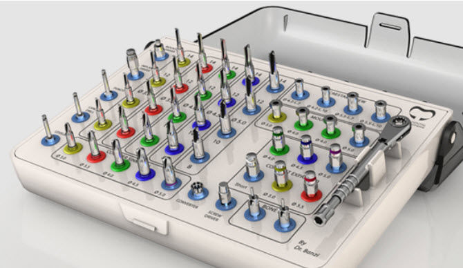 ست جراحی ایمپلنت شامل مجموعهای از ابزارهای طراحی شده برای مراحل مختلف جراحی می باشد. این ستها معمولاً توسط شرکتهای سازنده ایمپلنت طراحی و عرضه میشوند تا با نوع خاصی از ایمپلنت سازگار باشند. اجزای موجود در این ستها شامل دریلهای شماره بندی شده، آچار گشتاور، هولدر ایمپلنت، گاید دریل و متههای ابتدایی هستند. هدف از طراحی این ست، ایجاد نظم و دقت در روند جراحی است.